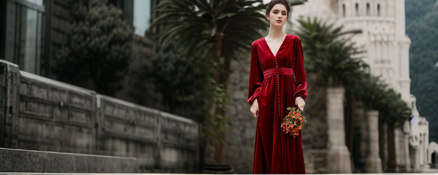 Vintage Velvet A-Line Dress with Embroidered V-Neck and Pearl Buttons