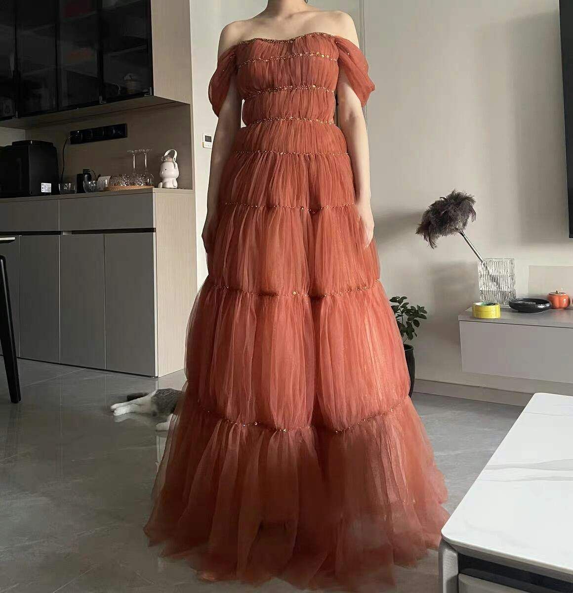 Turn heads and capture hearts with this luxurious rust orange ballgown. This romantic tiered tulle dress is the epitome of fairytale elegance, designed for formal occasions, proms, galas, and dreamy photo shoots.
