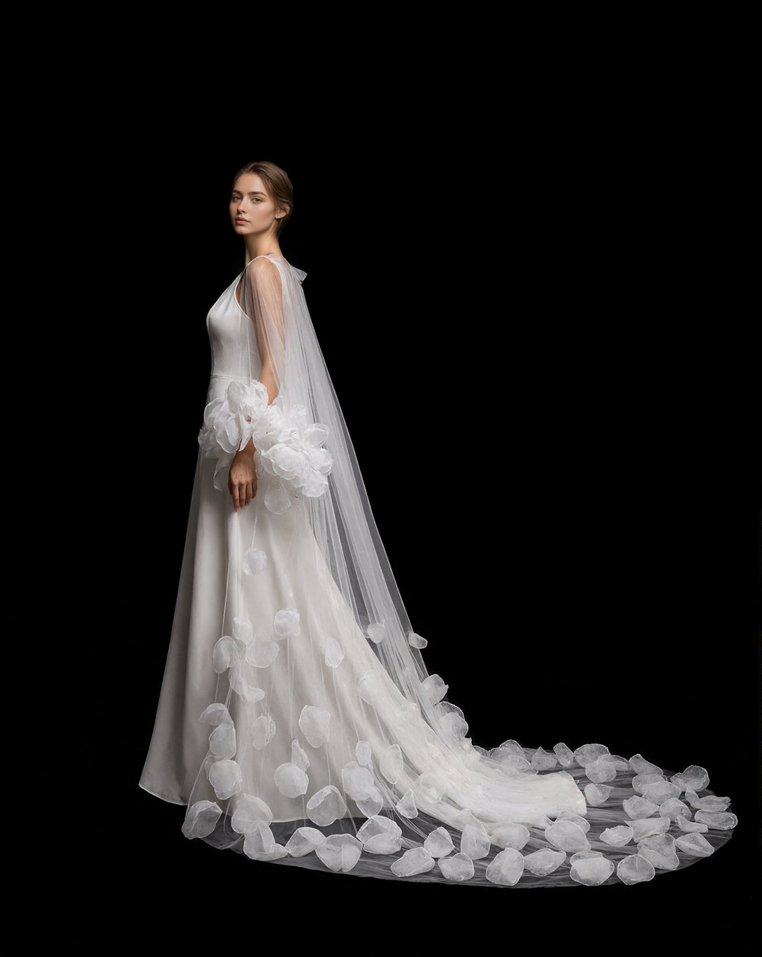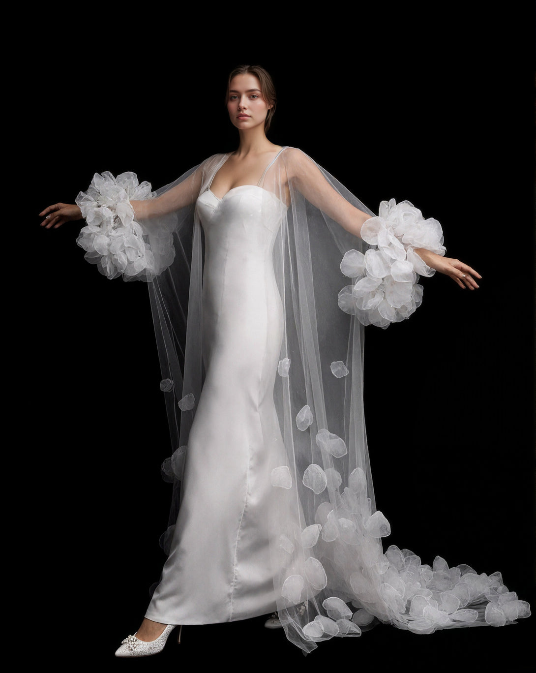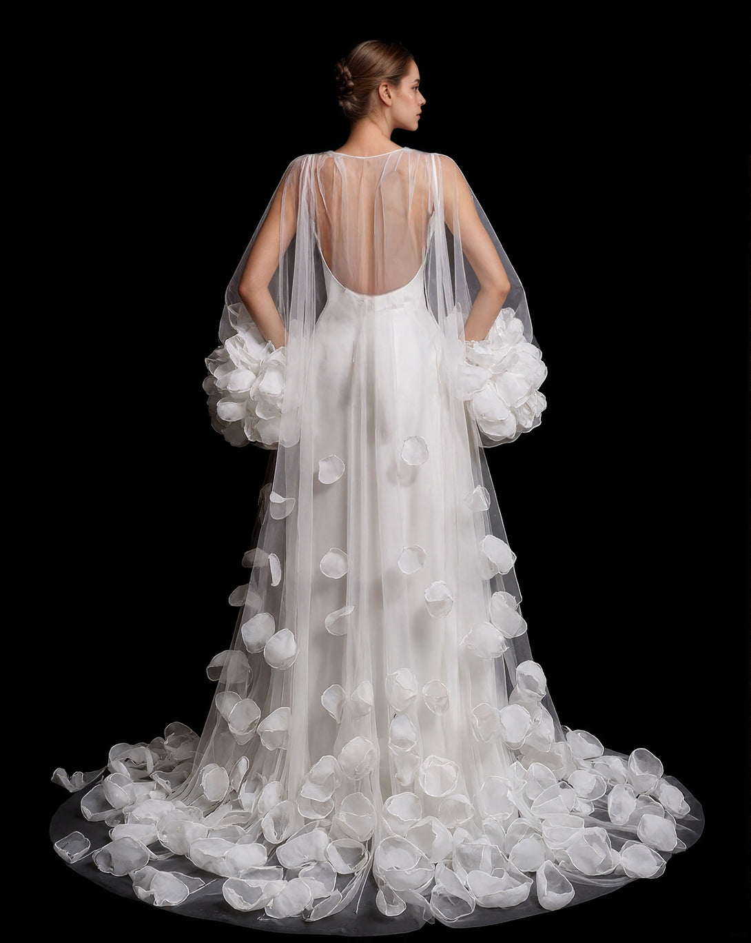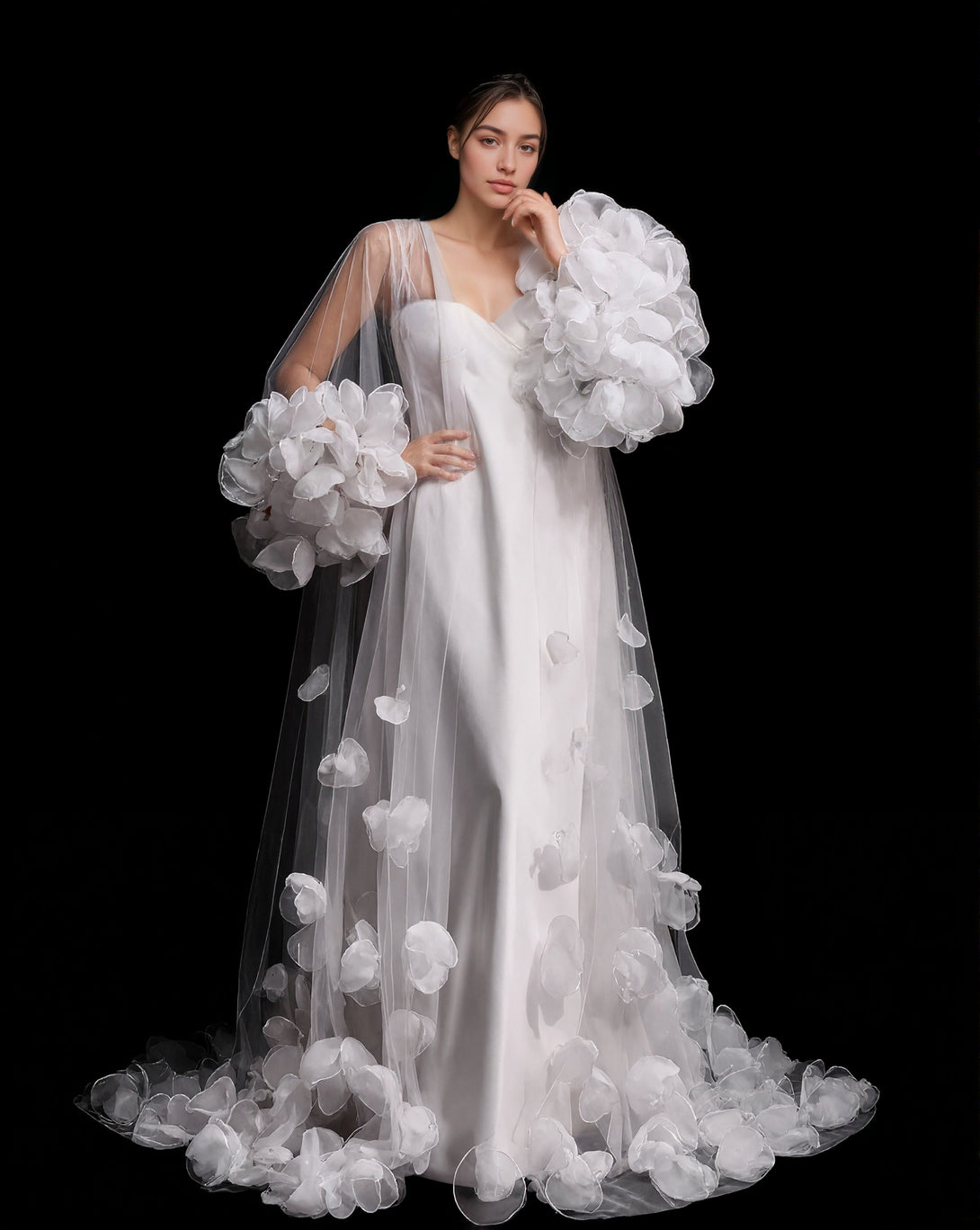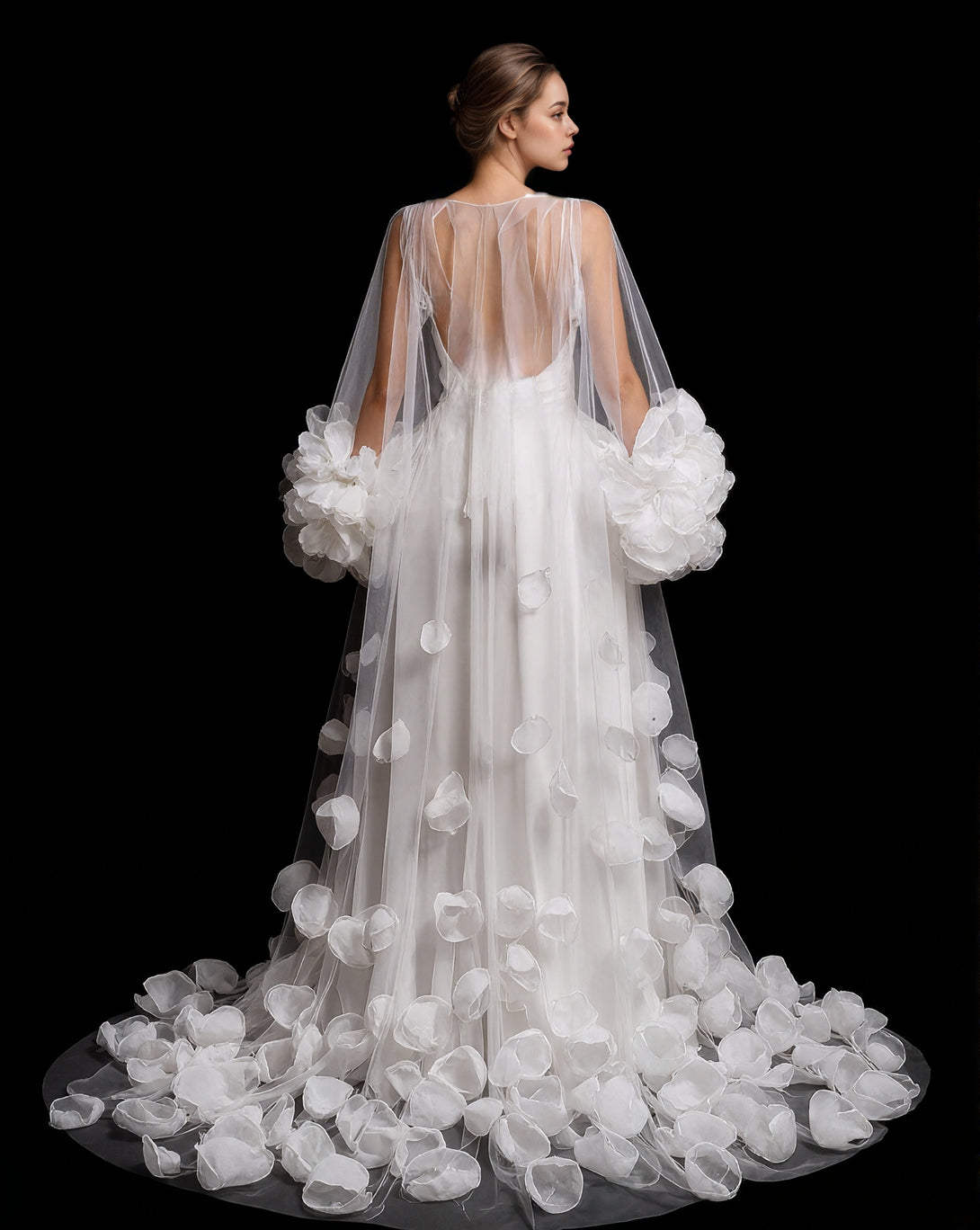 3D Petal Embellished Tulle Bridal Robe with Dramatic Puff Sleeves and Cathedral Train