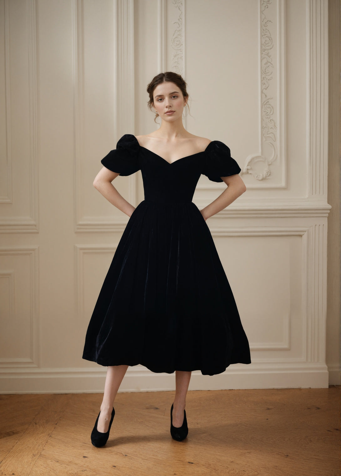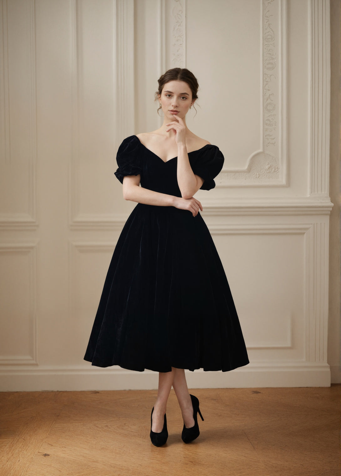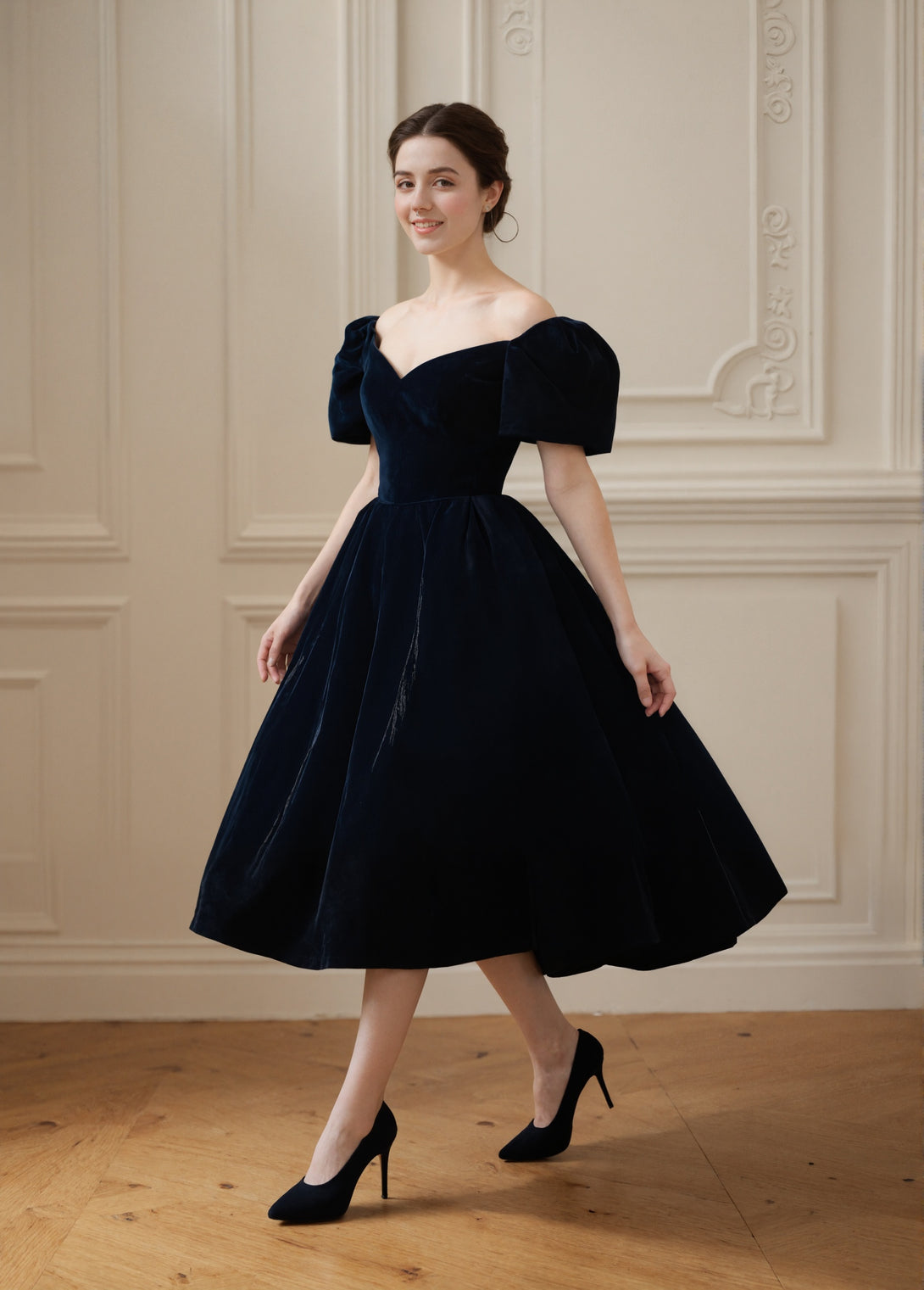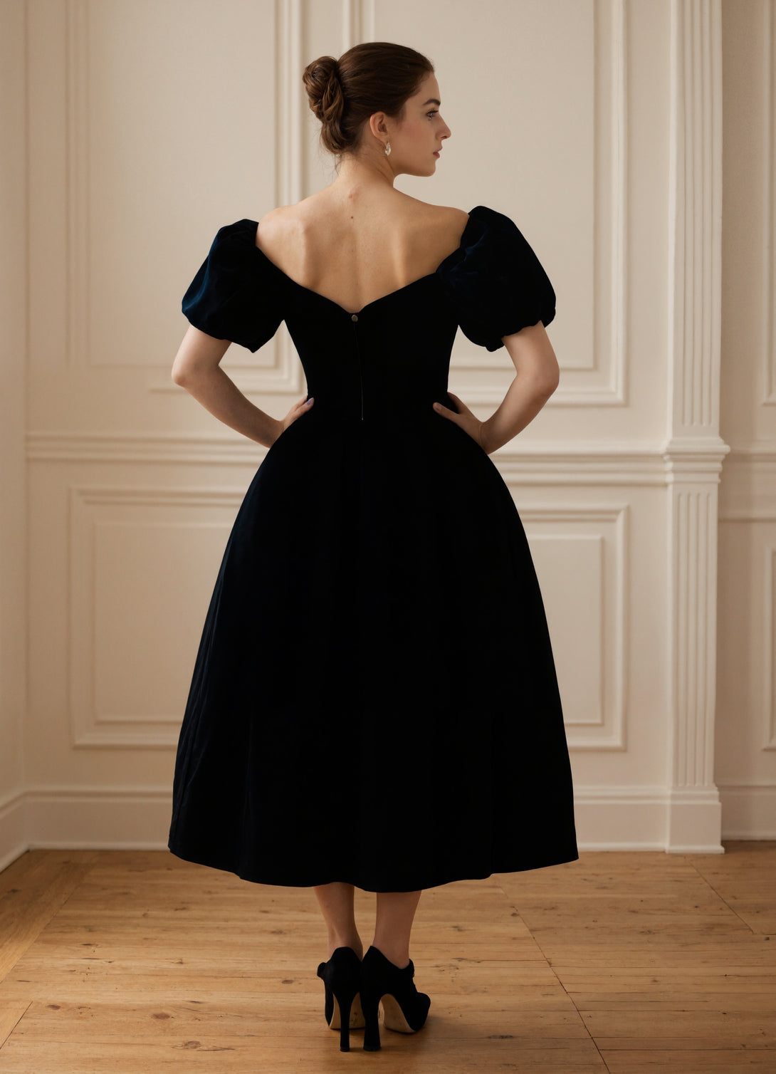 Experience timeless elegance in our Puffed Off-the-Shoulder Sleeves Ball Gown Tea-Length Velvet Dress. This exquisite gown combines the luxurious feel of velvet with a sophisticated tea-length design, making it the perfect choice for formal events, weddings, or special occasions where you want to make a statement.