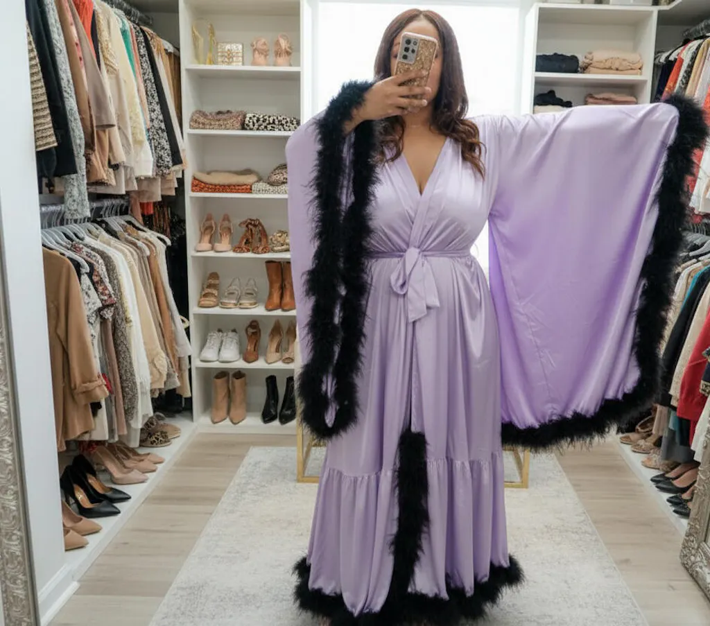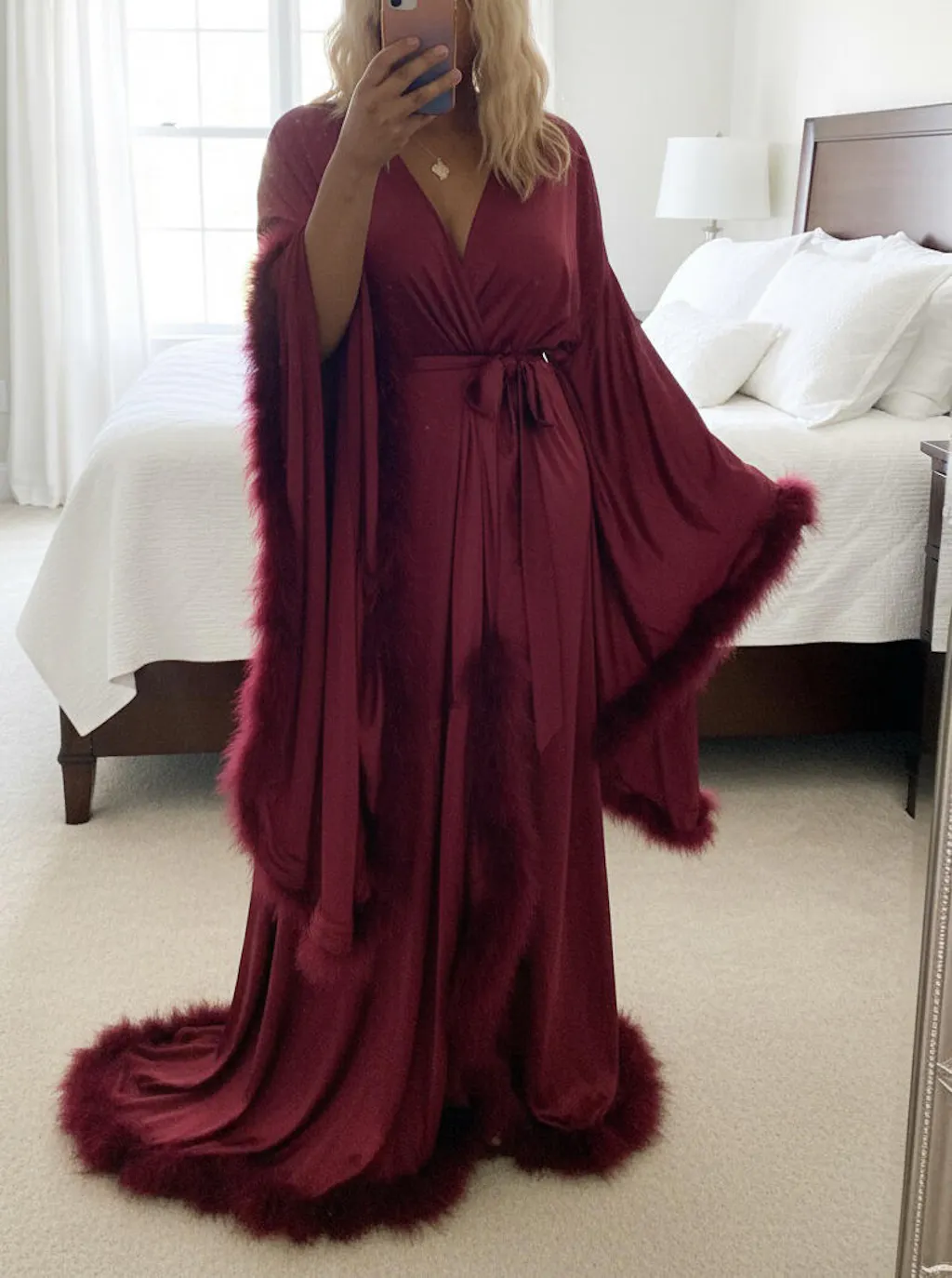 Turn heads this season in our signature satin robe with thick turkey-feather cuffs and hem. A glamorous luxury piece perfect for Christmas photoshoots, holiday parties, boudoir sessions, and formal winter events. Custom sizing & fast delivery available.